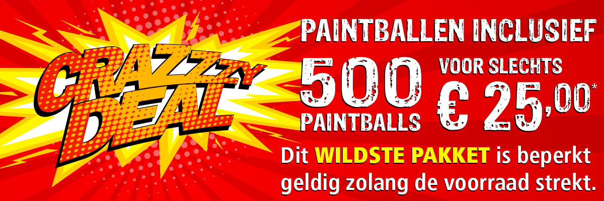 We kunnen echter maar een beperkt aantal personen van deze Crazy Deal laten genieten, daarom moet je op voorhand dit wildste pakket bestellen en betalen. Dan leggen wij alvast uw paintballs opzij.